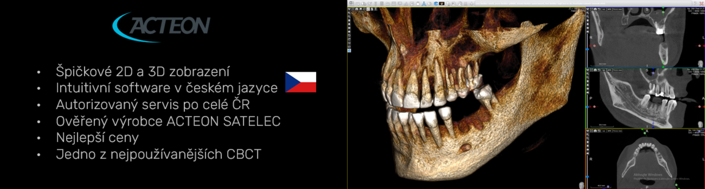3D CBCT rentgeny výrobce Acteon Satelec nabízí nejvyšší možnou kvalitu zobrazení. 3D CBCT zobrazení je dostupnější než kdy dříve. Přístroje X-Mind od Acteon Satelec poskytují velký výběr využití, které je určené pro potřeby implantologie, chirurgie, endodoncie i praktických zubních lékařů. Plánovací a zobrazovací software je v Českém jazyce a je považovaný za vůbec nejlepší imaging software na trhu, do kterého můžete integrovat také ostatní imaging zařízení Acteon. Intuitivní software zajišťuje přehledné a rychlé ovládání všem uživatelům. Pokud máte jakýkoliv dotaz ohledně 3D CBCT kontaktujte nás buďto skrze kontaktní formulář, telefonicky nebo kontaktujte svého obchodního zástupce. Jednotlivé systémy a přístroje jsou k vidění v našem showroomu, Je možné vyzkoušet a zjistit o nich více, pořádáme kompletní praktické kurzy po celé ČR, termíny a možnost přihlášení najdete v sekci Školení.