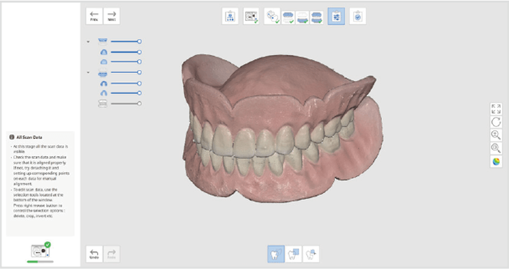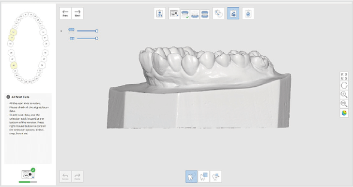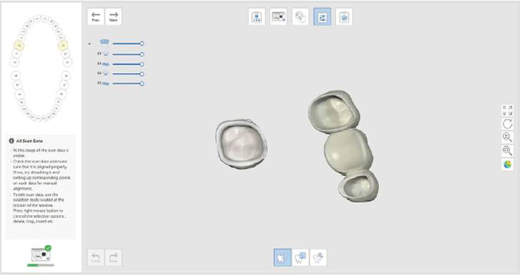 Medit Scan for Labs kombinuje data ze skenovaného sádrového detailního modelu s daty ze skenování otisků, díky tomu docílíte maximální přesnosti hranicie preparace ("marginu"). Kontrola hranice preparace na otisku je díky tomu přesná, spolehlivá a velmi snandá. Když skenujete jednotlivé sádrové detailní modely preparovaného zubu, software Medit Scan for Labs zarovná a integruje data sádrového modelu a data oboustranného otisku.