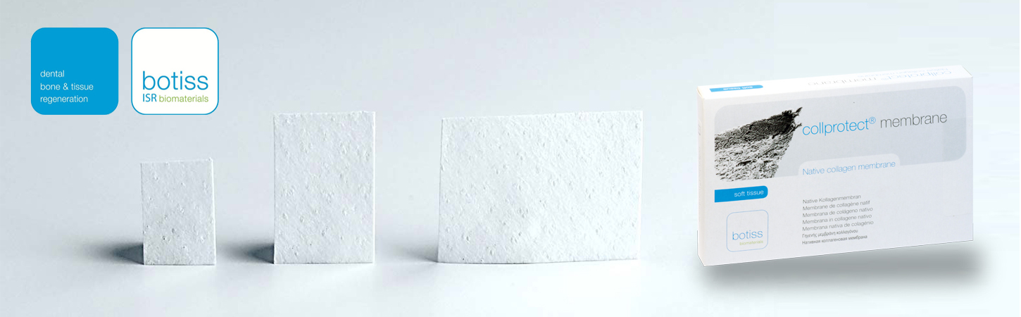Botiss Collprotect® membrána je nativní kolagenová membrána vyrobená z porcinní dermis, která je určena k regeneraci tvrdých a měkkých zubních tkání. Přirozený, hemostatický účinek kolagenu umožňuje včasnou stabilizaci rány a podporuje přirozené hojení. Membrána collprotect® navíc vykazuje dobrou povrchovou adaptaci a integraci tkáně a je ideální pro většinu indikací, kde je vyžadována střední stabilita a snadná manipulace.