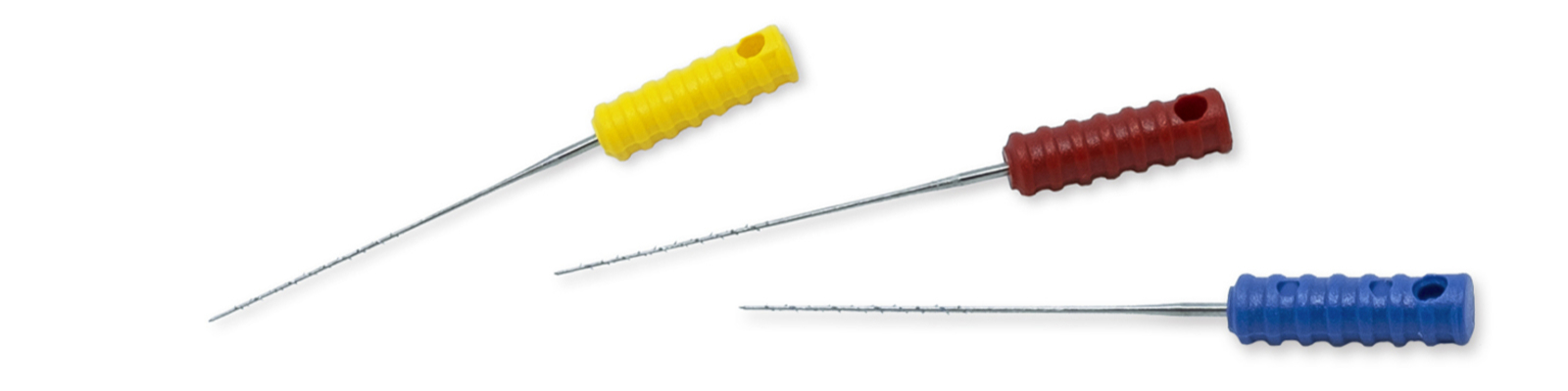 Sterilní VDW Nervové jehly jsou velmi populární pro svou vysokou účinnost při odstranění nervu z kořenového kanálku. Flexibilní ostny jsou uspořádány spirálovitě pro dokonalé uchycení a namotání nervu.