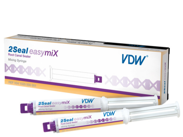 Pro dokonalé zaplnění kořenových kanálků. VDW 2Seal EasyMIX je nedráždivý dvousložkový výplňový materiál (sealer) ve dvoukomorové míchací stříkačce na bázi epoxy-amidové pryskyřice. Má velmi nízké smrštění, vysoká adheze ke gutaperčovému čepu a dentinu, je vysoce biokompatibilní a hodí se pro všechny techniky plnění. Doporučeno pro techniku plnění za tepla i za studena. Snadná aplikace s vyměnitelnými flexibilními kanylami, vždy smíchané v ideálním poměru, může být aplikován přímo do kořenového kanálku, přesná aplikace i v kanálcích s obtížným přístupem. Kompatibilní s produktem AH PLUS JET.