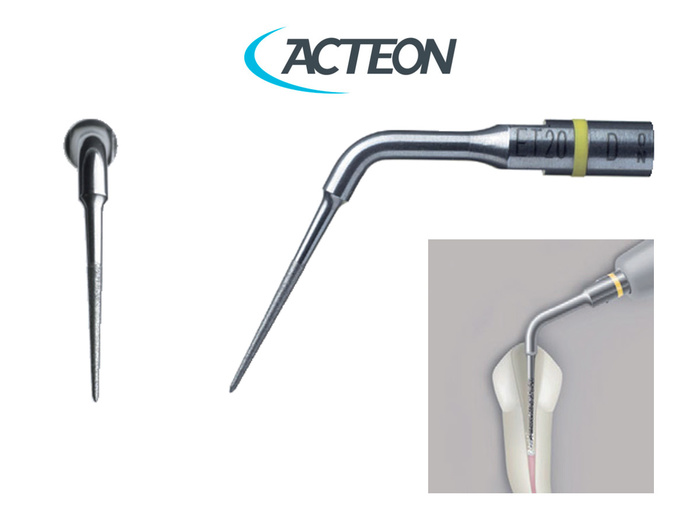 Špička ET20D z diamantem potažené oceli se používá v 1. koronální třetině k odstranění velmi tvrdých materiálů kartáčováním stěn.