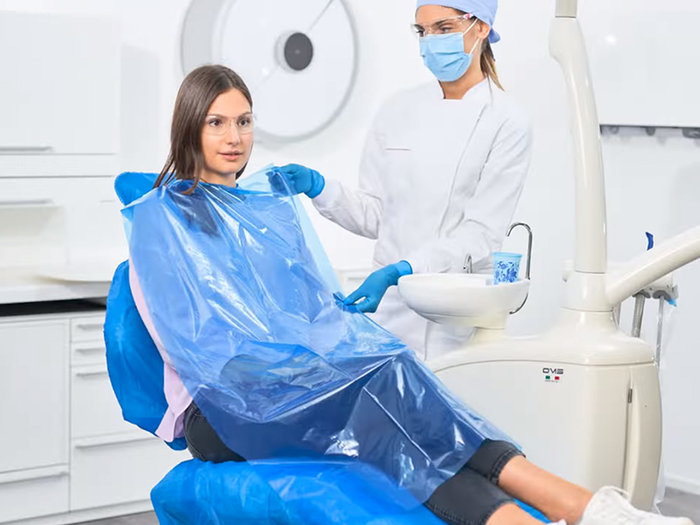 Ochranný voděodolný plášť pro pacienta vyrobený z polyethylenu.