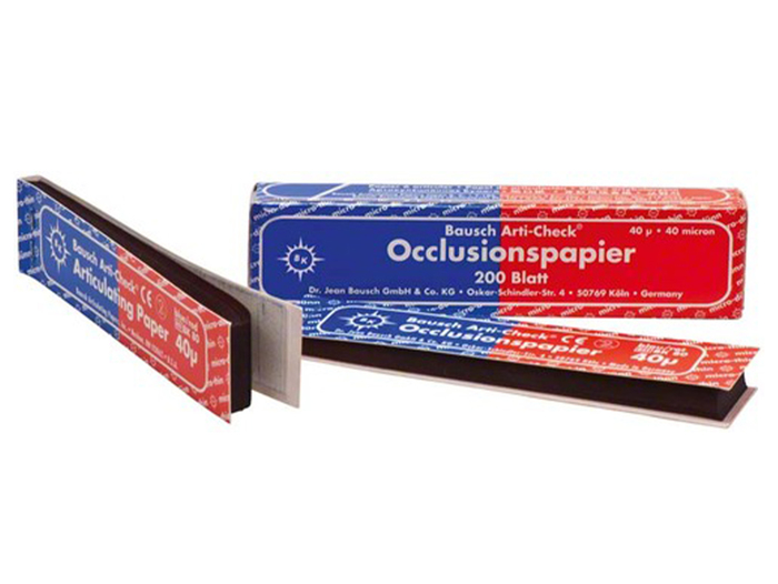 Artikulační papír Bausch modročervený s vysoko viskózní voskovou emulzí na precizní vykreslení kontaktních míst, síla 40μ. Bal. 200ks.