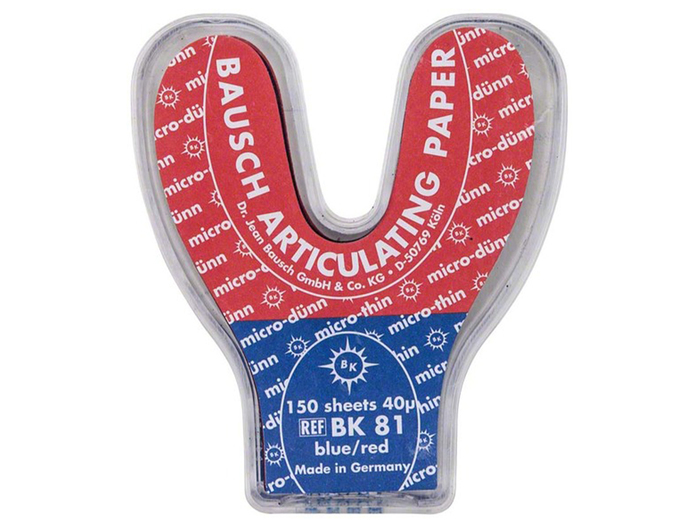 Artikulační papír Bausch modročervený s vysoko viskózní voskovou emulzí na precizní vykreslení kontaktních míst, podkova, síla 40μ. Bal. 150ks.