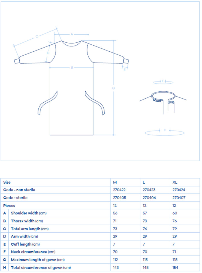 Odolné modré chirurgické pláště, vyrobené z vysoce kvalitního vodoodpudivého SMS mikrovlákna. Vysoký komfort nošení s bílými bavlněnými manžetami. Materiál je tkaný ze dvou vrstev spunbondu a tavného foukaného filtru a vytváří robustní, lehce prodyšné a velmi vodoodpudivé mikrovlákno. Samostatně balené sterilní, nebo nesterilní. Dostupné ve velikostech M, L nebo XL.