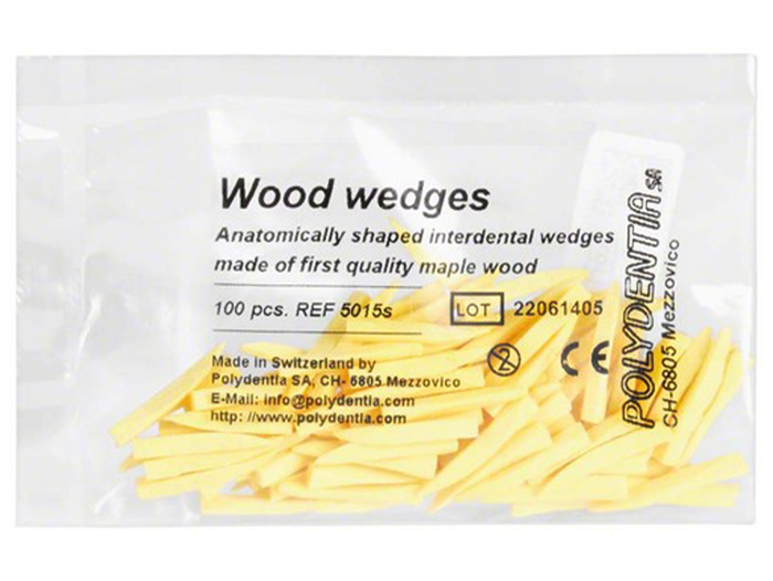 Anatomicky tvarované interdentální klínky z vysoce kvalitního javorového dřeva. Obsah: 100ks klínků, žluté-15mm.