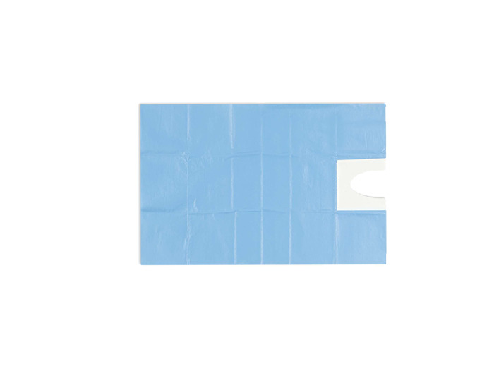 Chirurgická rouška pro zakrytí oblasti čelisti z vodoodpudivé netkané textilie. Pro ochranu před vlhkostí je spodní strana laminována polyetylenovou fólií.
