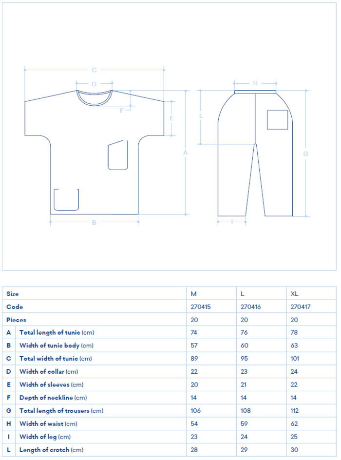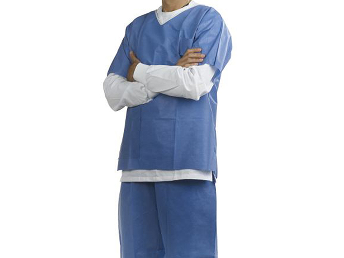 Dvoudílný modrý chirurgický oblek vyrobený z vodoodpudivého a prodyšného mikrovlákna SMS. Skládá se z topu s krátkým rukávem, s výstřihem do V a dlouhými kalhotami.