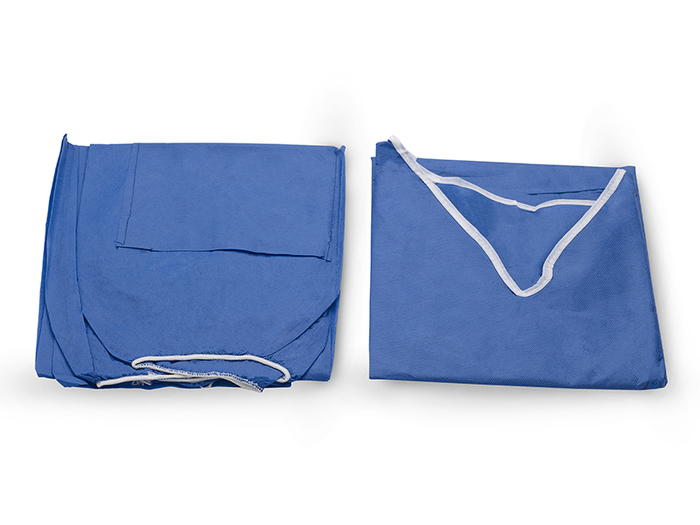 Dvoudílný modrý chirurgický oblek vyrobený z vodoodpudivého a prodyšného mikrovlákna SMS. Skládá se z topu s krátkým rukávem, s výstřihem do V a dlouhými kalhotami.