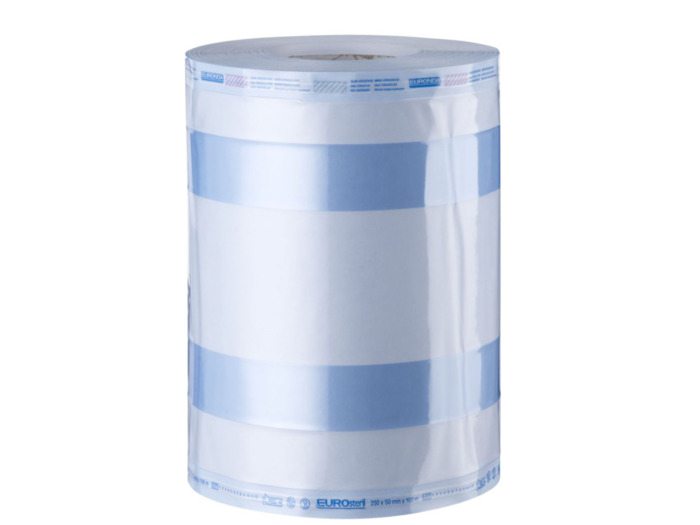 Profesionální vyztužené sterilizační role EurosterilR s trojitým bočním těsněním a dvojitou vrstvou světle modré polyesterové / polypropylenové folie vyrobené z nejlepších certifikovanych materialů a lékařského pevného papíru s vysokou gramáží (60 g/m2). Dokáže udržet trvanlivost sterility nástrojů až 6 měsíců.