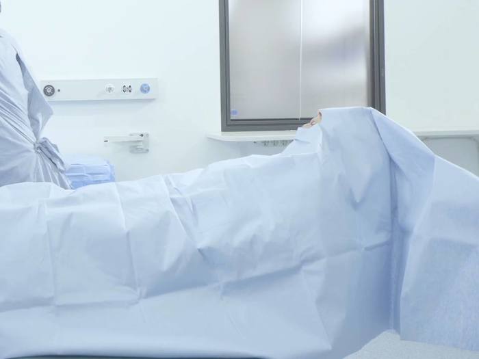 Chirurgická zástěra s decentralizovaným otvorem z voděodolné netkané textilie. Spodní strana je chráněna proti pronikání vlhkosti vodotěsnou PE fólií. Lepicí pásek kolem výřezu umožňuje bezpečné upevnění a nabízí zvýšenou ochranu proti šíření choroboplodných zárodků a uklouznutí.