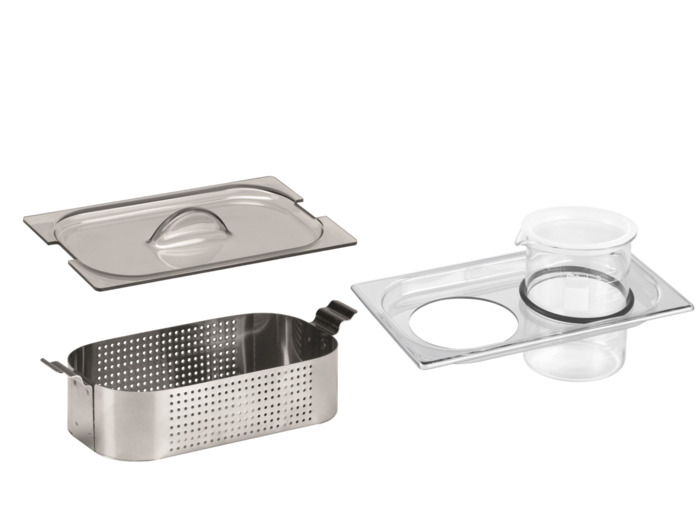 V systému Eurosonic 3D se používá osvědčená technologie režimu Sweep od Euronda. Trvalé změny frekvence jsou generovány pomocí digitálního řízení. To znamená, že čištění je obzvláště důkladné a rychlé. E-Controller na Eurosonic® 3D podporuje osvětlovací systém E-Light. Takže máte neustále přehled o stavu čištění a zařízení. Nerezová vana má objem tři litry. K dispozici jsou doby cyklů až 30 minut při konstantní teplotě 60 ° C nebo 35 ° C. V případě potřeby lze ultrazvukovou lázeň provozovat i bez ohřevu. Volitelné příslušenství pro Eurosonic® 3D (není součástí balení): Nedeformovatelné, poloprůhledné plastové víko, perforovaný závěsný koš z nerezové oceli, držák na 2 šálky, skleněné šálky o objemu 600 ml.