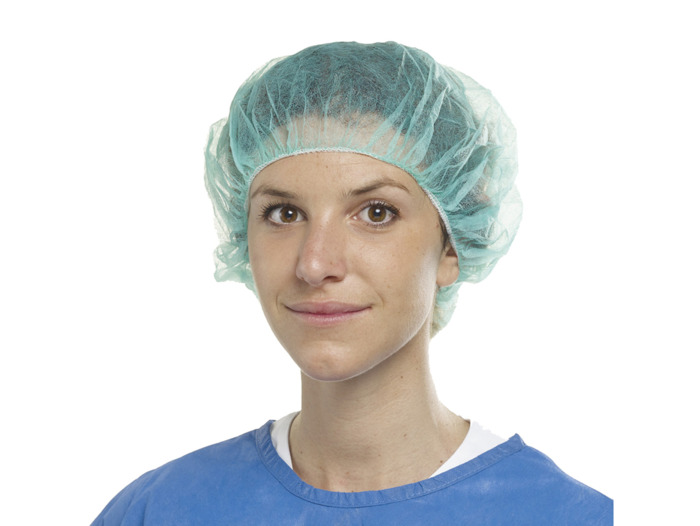Klasická chirurgická čepice ve tvaru baretu vyrobená z lehké netkané textilie v barvách mátově zelené nebo světle modré. Všestranný elastický pás se přizpůsobí příslušné velikosti hlavy a drží vlasy pohromadě pod kapucí.