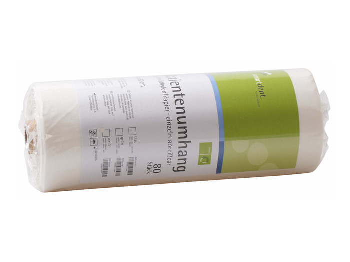 Jednorázová zástěra pro pacienta - kombinace tenké PE-fólie a savé celulózy. S vybráním na krk a s páskami na uchycení.