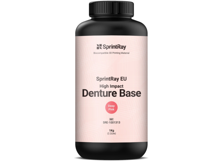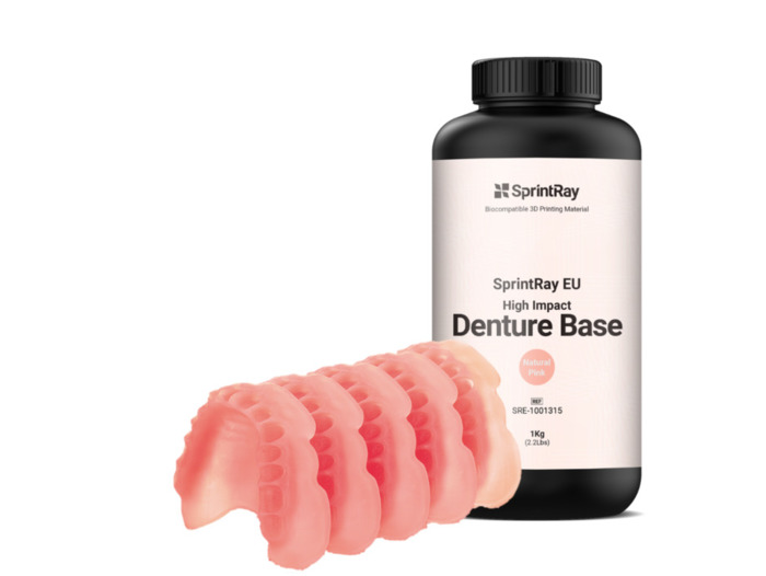 Digitální zubní protézy mohou snížit počet schůzek potřebných pro umístění zubní protézy. Pryskyřice SprintRay EU High Impact Denture Base je biokompatibilní pryskyřice pro 3D tisk pro generativní výrobu základů zubních protéz. SprintRay EU High Impact Denture Base je k dispozici v oranžové růžové, přírodní růžové, světle růžové a tmavě růžové.
