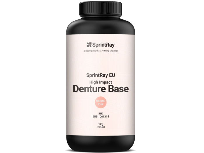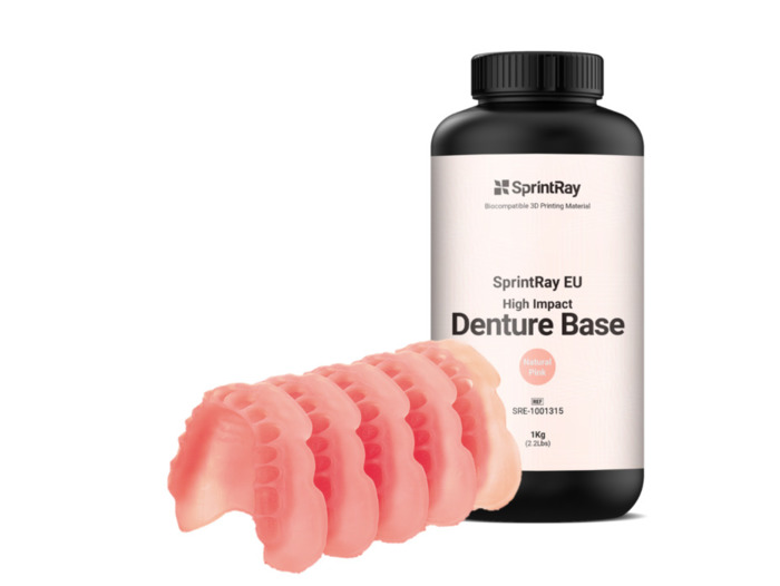 Digitální zubní protézy mohou snížit počet schůzek potřebných pro umístění zubní protézy. Pryskyřice SprintRay EU High Impact Denture Base je biokompatibilní pryskyřice pro 3D tisk pro generativní výrobu základů zubních protéz. SprintRay EU High Impact Denture Base je k dispozici v oranžové růžové, přírodní růžové, světle růžové a tmavě růžové.