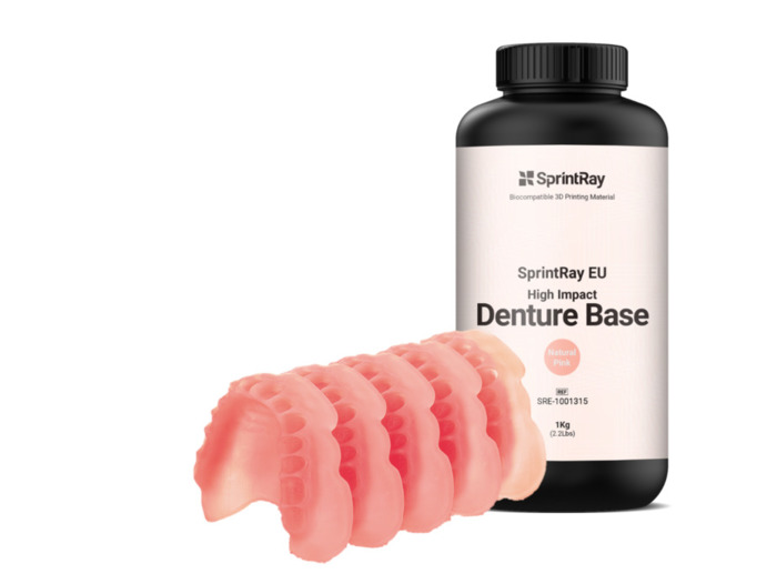 Digitální zubní protézy mohou snížit počet schůzek potřebných pro umístění zubní protézy. Pryskyřice SprintRay EU High Impact Denture Base je biokompatibilní pryskyřice pro 3D tisk pro generativní výrobu základů zubních protéz. SprintRay EU High Impact Denture Base je k dispozici v oranžové růžové, přírodní růžové, světle růžové a tmavě růžové.