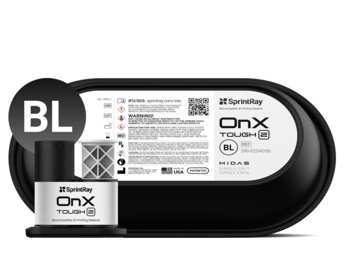 OnX Tough 2 od SprintRay je vysoce pevná kapslová pryskyřice určená pro výrobu implantátových suprastruktur a náročných protetických prací, zejména full-arch rekonstrukcí.