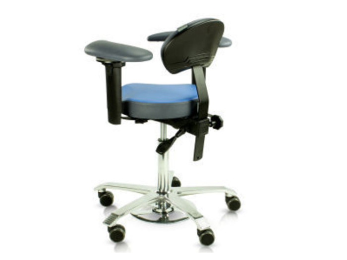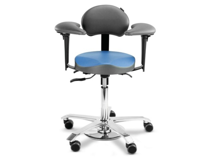 Ergonomická zdravotní stomatologická židle pro práci s mikroskopem. Poskytuje výbornou podporu při dlouhých statických pracovních zákrocích a menší fyzické namáhání. Židlička má jedinečné ergonomicky tvarované područky. Pohodlné otočné loketní opěrky lze umístit blízko vašeho těla a poskytnout tak optimální oporu předloktím. Područky jsou výškově nastavitelné, takže můžete sedět rovně. Můžete zaujmout uvolněnou pracovní polohu vsedě. Krk, ramena a záda jsou uvolněné, pohodlnější sezení zpříma.