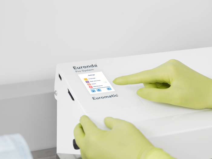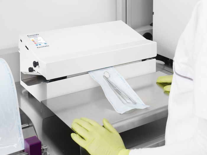Díky zcela přepracovanému designu a novým funkcím je Euromatic® samonavíjecí tepelná svářečka s technologií kontinuálního cyklu. Má těsnící rychlost 8 m / min, což je ideální pro kliniky s velkým počtem připravovaných svařovaných folií / sáčků ke sterilizaci. Jednoduše vložte obal obsahující nástroje a Euromatic® ho automaticky natáhne, dokud nedosáhne koncové polohy, a poté jej dokonale uzavře a utěsní. Kromě toho jsou data vybraná operátorem vytištěna přímo na sáčku vestavěnou tiskárnou, která obsahuje nový systém pro optimalizaci tiskových kazet. Plně v souladu s normami UNI 868-5 a EN 11607-2.