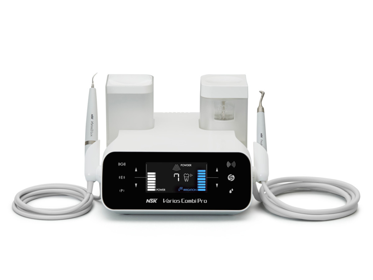 NSK Varios Combi Pro LED - ultrazvuk s pískovačem Kombinace 2 v 1. Víceúčelový ultrazvukový scaler s funkcemi paro, endo, miniinvazivní preparací a profylaktický pískovač s možností pískovat supra- i subgingiválně. Ultrazvukový scaler má bílé LED osvětlení. Na výběr z více jak 60 druhů koncovek pro různá použití. Ultrazvukový scaler využívá vlastní nádobu o obsahu 400 ml nebo je možné přepnout na vodu z řadu.