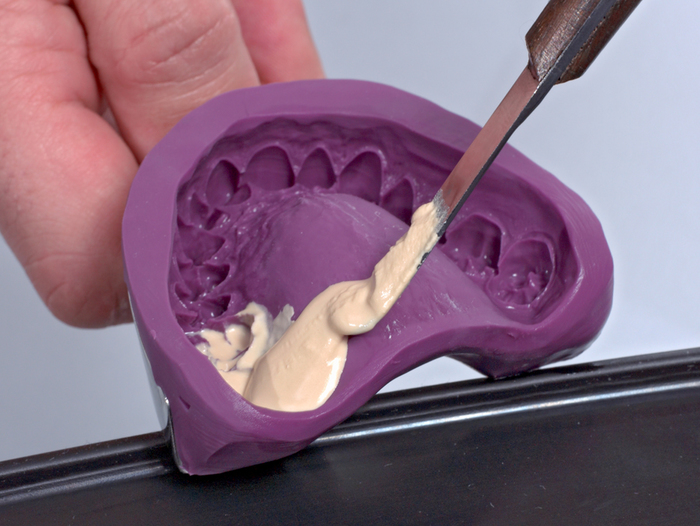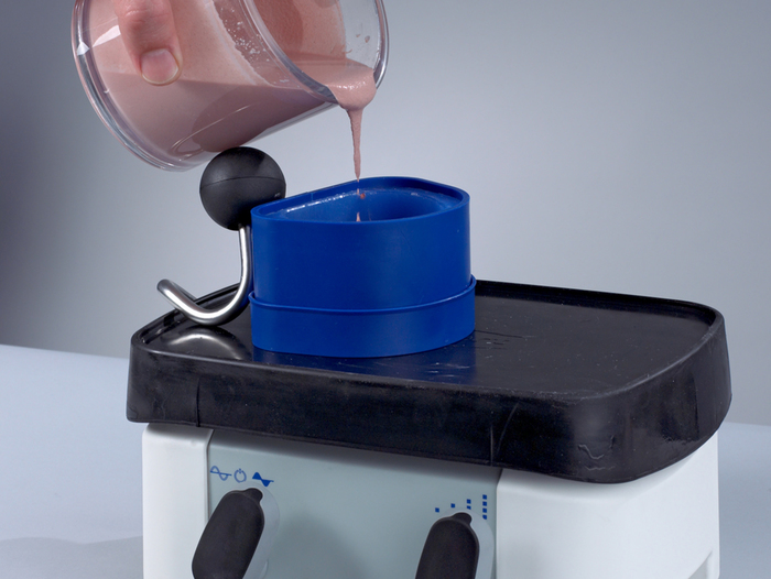 Dva různé stupně tvrdosti gumové podložky.Přímý přenos vibrací na tvrdé podložce, aby otiskovací lžička neodskakovala od tvrdého materiálu. Může být položena na měkký okraj.